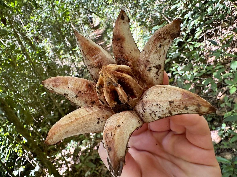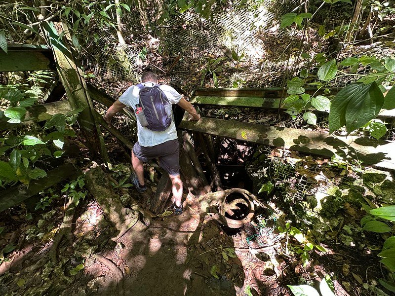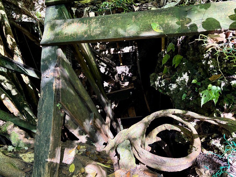 We’d brought headlamps for exploring, but when we reached the cave (after slowly descending the side of the mountain via a series of rotting and collapsing stairs), the opening looked like the entrance to an abandoned mineshaft. The “stairs” were sticks of wood going every whichaway, and they were in various stages of decomposition.