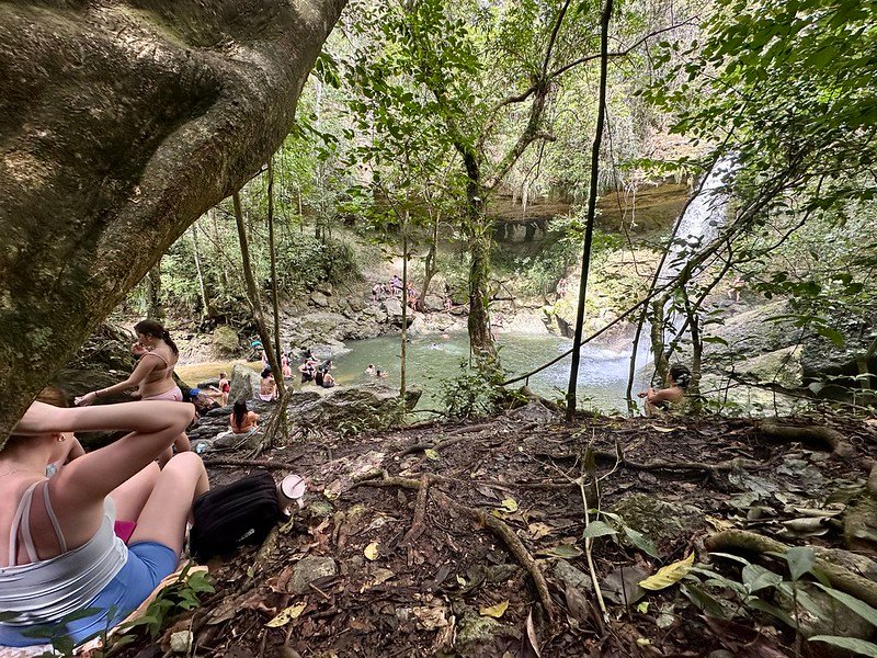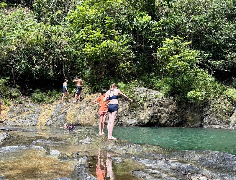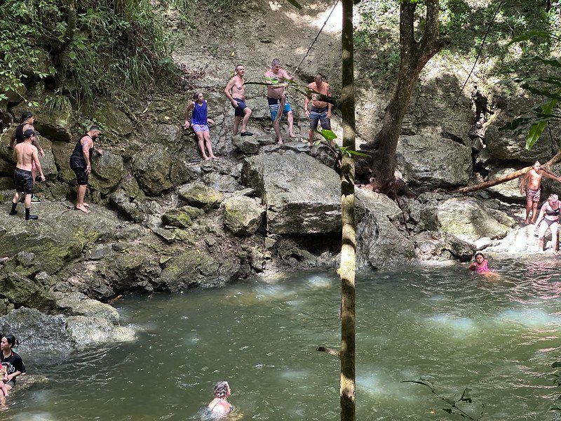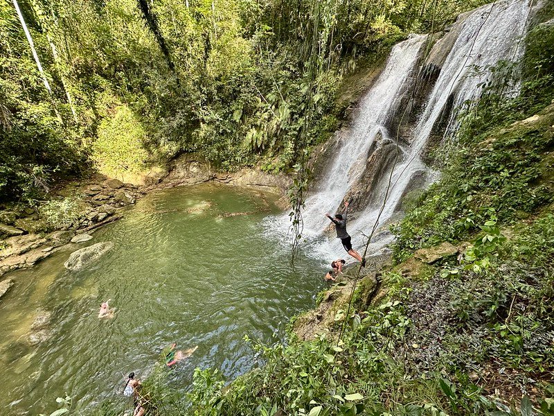 After the hike, we headed to the Gozalandia waterfalls. The upper falls was swarming with people and had a rope swing. I was terrified to jump, but my husband made me do it.